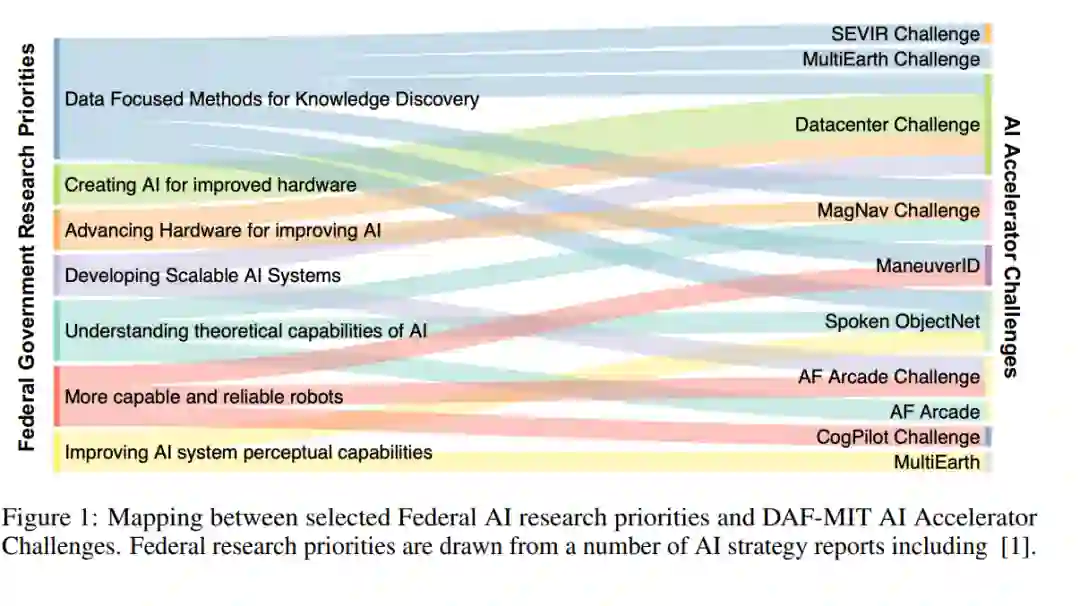 2019年,美国联邦政府通过第13859号行政命令概述了一项广泛的战略,以确保在人工智能领域的领导地位。[1]概述了这一战略的核心,即实现美国人工智能领导地位所需的大量研究投资。这些研究推力的例子显示在图1的左边(来自[1])。联邦政府组织,如国防部和空军部门,开发了自己的AI战略,以实现13859号行政命令的广泛目标。空军部门的一项倡议是在麻省理工学院主办的人工智能加速器(DAF-MIT AI加速器)的开发。加速器由来自麻省理工学院和空军部门的多学科团队组成,以开发能够在空军和太空部队以及整个社会推进AI的基础技术。为了推动相对较新的领域的创新,并充分参与更广泛的AI社区,加速器正在开发一系列“挑战”问题。这些“挑战”包括开放数据集、基准、问题定义、指标、基线实现,并解决诸如天气预测、数据中心优化和人机界面等科学问题。并行开发多个挑战也支持了协同活动。例如,我们能够开发可复制的管道来发布开源数据集,提供统一的计算平台,并利用为一个挑战创建的数据来应对其他挑战。