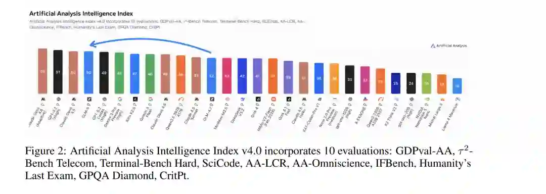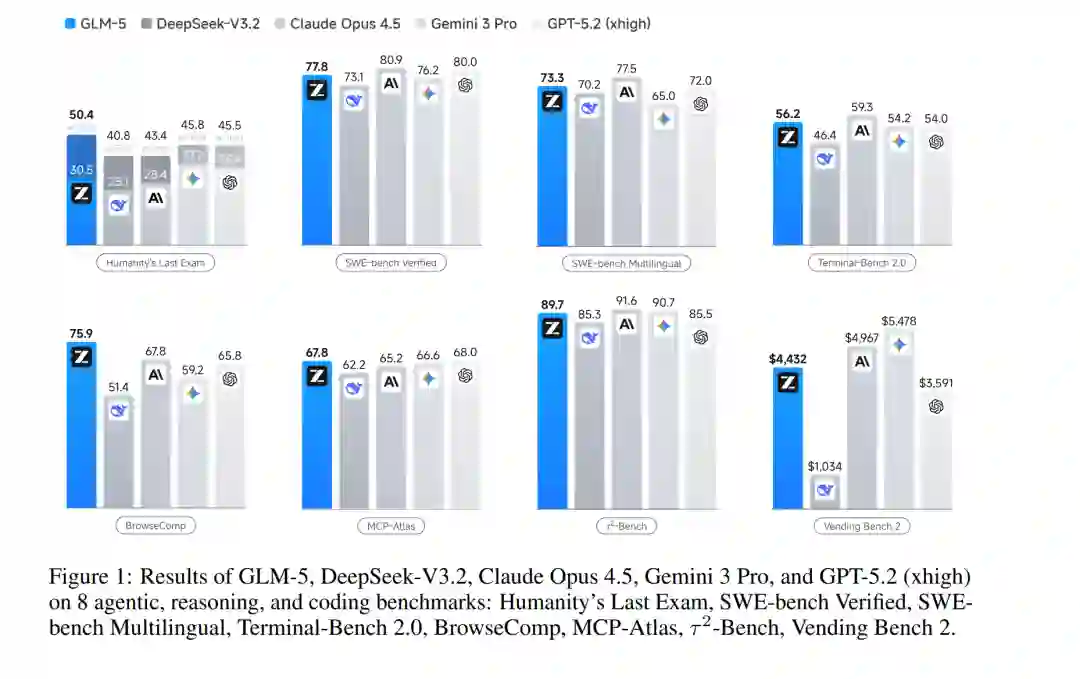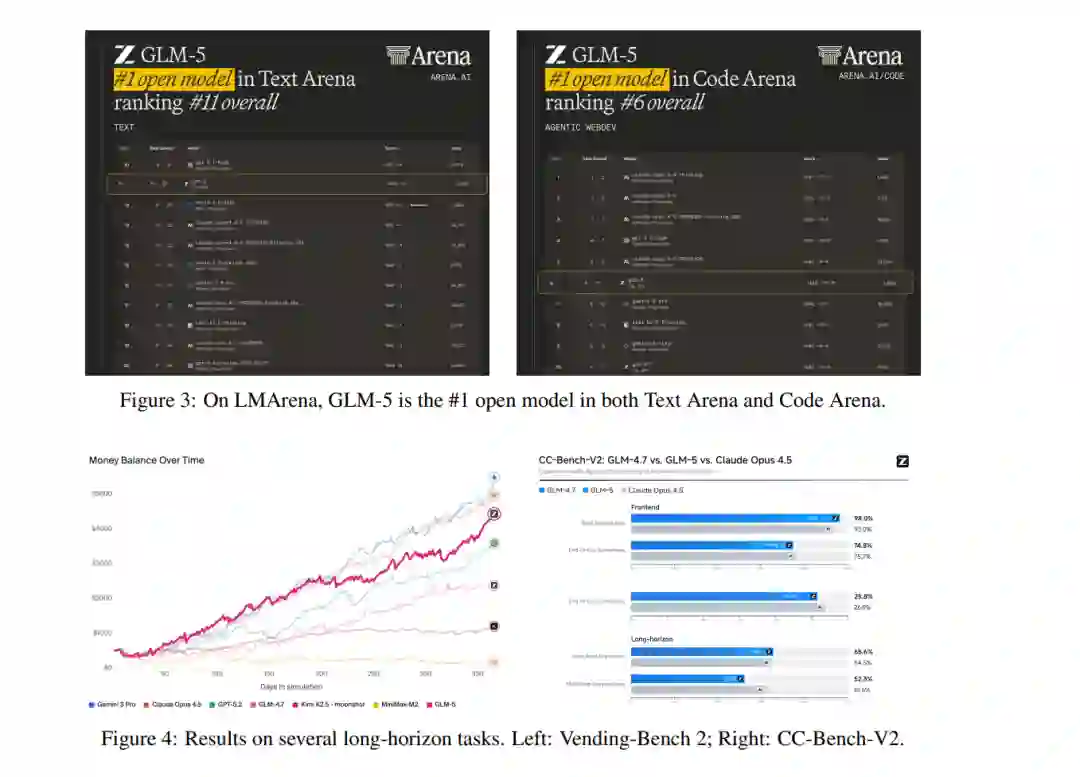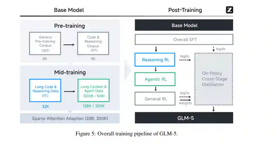 我们推出 GLM-5,这是我们的下一代旗舰模型,旨在克服这些障碍。GLM-5 代表了性能与效率的范式转变,在包括 ArtificialAnalysis.ai、LMArena Text 以及 LMArena Code 在内的主要公开榜单中均达到了 SOTA 地位。更具意义的是,GLM-5 重新定义了真实世界编程的标准,展现出处理复杂端到端软件开发任务的前所未有的能力,其范围远超 SWE-bench 等传统静态基准测试。 结果 (Results)。 图 1 展示了 GLM-5、GLM-4.7、Claude Opus 4.5、Gemini 3 Pro 以及 GPT-5.2 (xhigh) 在 8 项智能体、推理与编程基准测试中的结果,包括:Humanity’s Last Exam [34]、SWE-bench Verified [19]、SWE-bench Multilingual [53]、Terminal-Bench 2.0 [45]、BrowseComp [50]、MCP-Atlas [6]、$\tau^2$-Bench [55; 7] 以及 Vending Bench 2 [3]。平均而言,GLM-5 较上一版本 GLM-4.7 提升了约 20%,与 Claude Opus 4.5 和 GPT-5.2 (xhigh) 持平,且优于 Gemini 3 Pro。 GLM-5 在 Intelligence Index v4.0 中得分 50,成为新的开源权重模型领跑者(参见图 2),较 GLM-4.7 的 42 分实现了 8 分的跨越——这一增长主要由智能体性能的提升以及知识/幻觉问题的改善所驱动。这是开源权重模型首次在 Artificial Analysis Intelligence Index v4.0 上达到 50 分。 由加州大学伯克利分校(UC Berkeley)发起的 LMArena 是一个透明的共享平台,通过数百万个真实任务(包括写作、编程、推理、设计、搜索和创作)的人类判断来评估和比较前沿 AI 能力。海量的人机交互产生了反映真实世界实用性的信号,使其区别于其他静态基准测试。图 3 显示,GLM-5 在文本竞技场(Text Arena)和编程竞技场(Code Arena)中再次蝉联开源模型第一,整体水平与 Claude-Opus-4.5 和 Gemini-3-pro 相当。 智能体的长期一致性(Long-term coherence)正变得愈发重要。编程智能体现已能够自主编写代码数小时,且 AI 模型能够完成的任务长度与广度可能会持续增加。我们使用 Vending-Bench 2 和 CC-Bench-V2 两个基准测试来评估 GLM-5 完成长程任务(long-horizon tasks)的能力。Vending-Bench 2 用于衡量 AI 模型在长期经营业务中的表现:模型需模拟经营一家自动售货机公司长达一年,并根据最终的银行账户余额进行评分。图 4(左)显示,GLM-5 在所有开源模型中排名第一,最终账户余额为 4,432 美元,接近 Claude Opus 4.5,展现出强大的长期规划与资源管理能力。图 4(右)进一步展示了在我们内部评估套件 CC-Bench-V2 上的结果。GLM-5 在前端、后端及长程任务上均显著优于 GLM-4.7,缩小了与 Claude Opus 4.5 的差距。 方法 (Methods)。 图 5 展示了 GLM-5 的整体训练流程。我们的基座模型训练始于 27 万亿(27T)token 的海量语料库,并在早期阶段优先考虑编程与推理数据。随后,我们采用了独特的“中阶训练”(Mid-training)阶段,将上下文长度从 4K 逐步扩展至 200K,重点针对长文本智能体数据,以确保复杂工作流中的稳定性。在后训练(Post-Training)阶段,我们超越了标准的监督微调(SFT),实现了一套序列化强化学习流水线:从推理 RL(Reasoning RL)开始,随后是智能体 RL(Agentic RL),最后以通用 RL(General RL)收尾。至关重要的是,我们在整个过程中采用了同策略跨阶段蒸馏(On-Policy Cross-Stage Distillation),以防止灾难性遗忘,确保模型在成为强力通用模型的同时,保留其敏锐的推理优势。总而言之,GLM-5 性能的飞跃主要源于以下技术贡献: