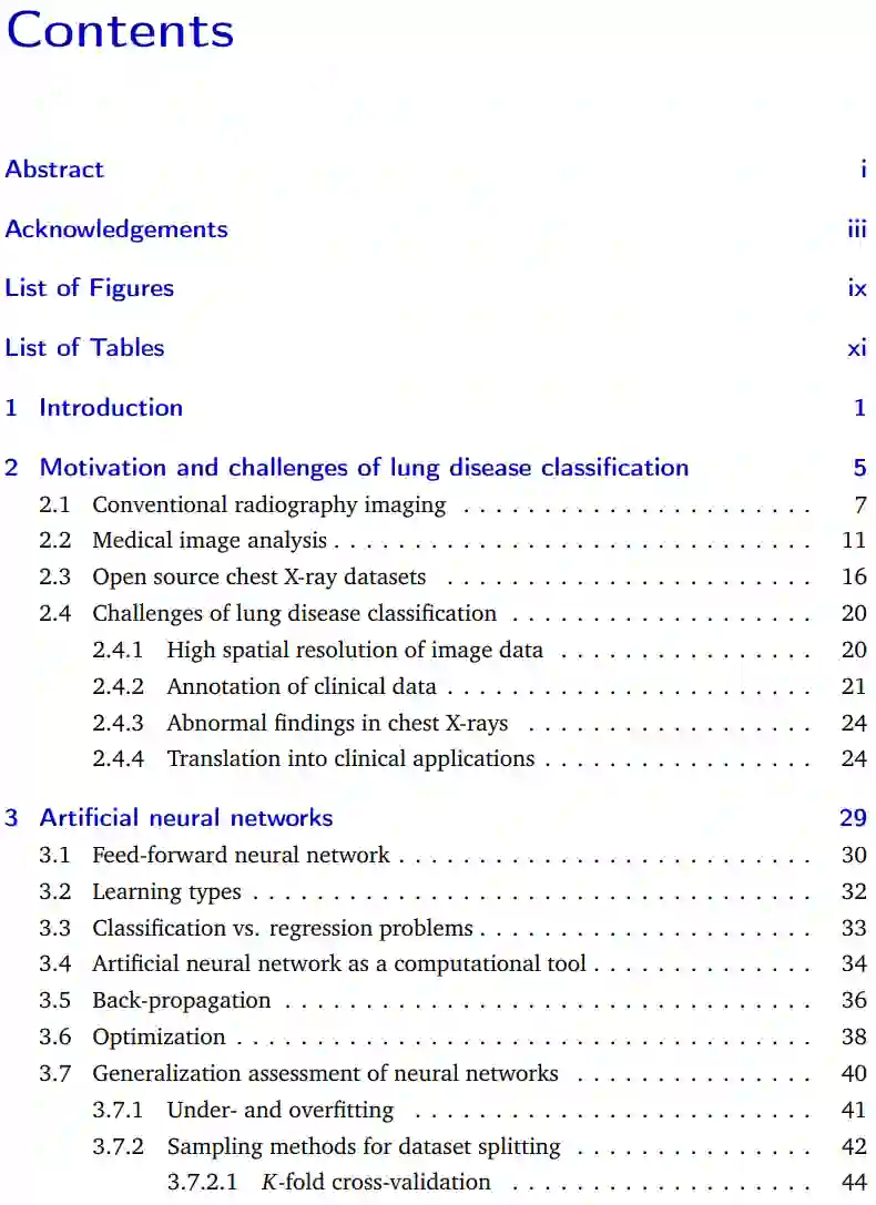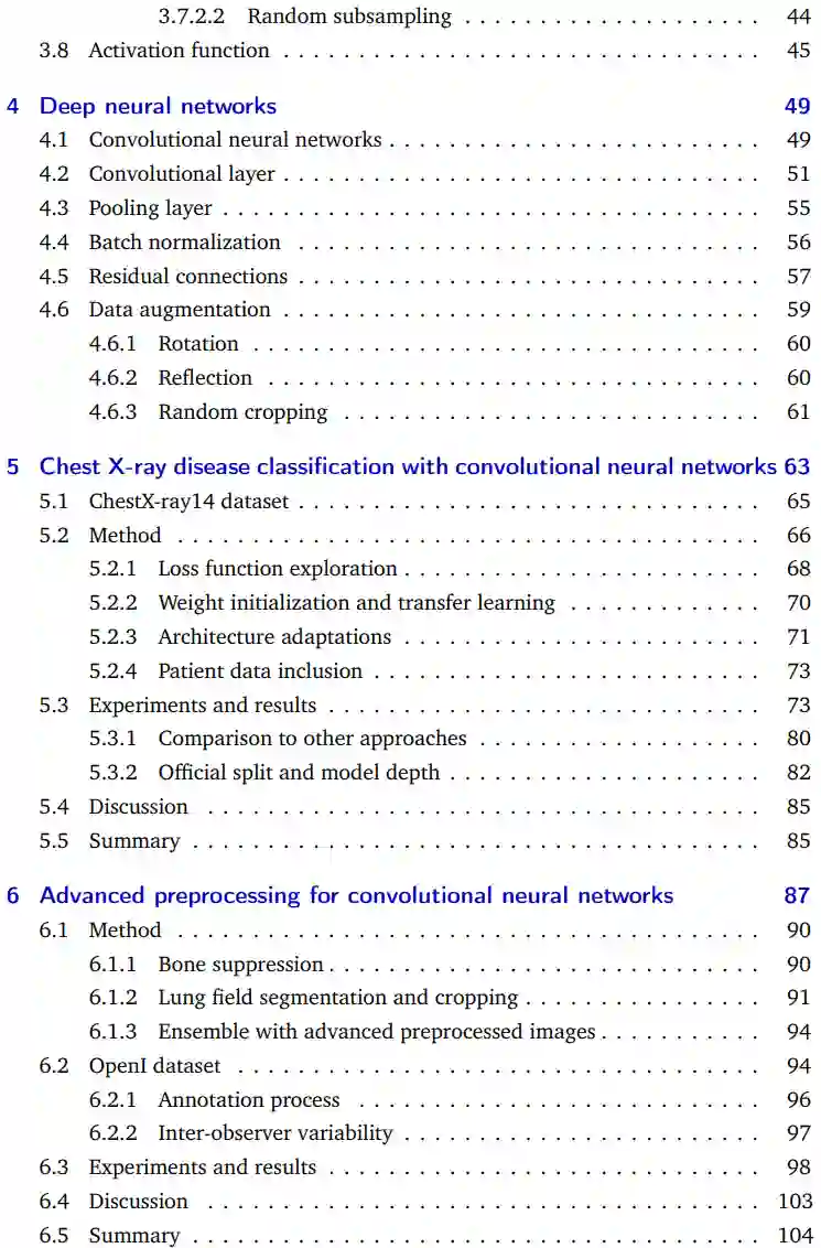 第 2 章简要介绍了医学成像及其自动化分析。此后,对深度学习的胸部 X 射线分析进行了全面回顾。作为深度学习快速发展的最重要推动力之一,我们讨论了 ChestX-ray14 [Wang et al., 2017] 和 OpenI [Demner-Fushman et al., 2016] 等开源数据集。随后讨论了由自然语言处理 (NLP) 生成的噪声注释以及高分辨率胸部 X 射线数据所带来的挑战。最后,我们在当前挑战的背景下检查了胸部 X 射线分类的临床应用。