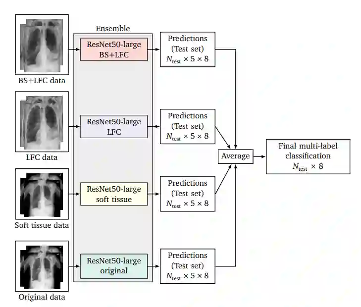 图 6.3:用于组合高级预处理图像的集成方法。四个 ResNet50-large 模型在不同的图像数据上进行了训练:原始、软组织、肺野裁剪 (LFC) 和使用 LFC 的骨抑制 (BS)。每个模型预测了测试集 Ntest 中五个裁剪图像(即中心和所有四个角)的分数,具有八个类别。此后,对所有模型的预测分数进行平均,以获得最终的多标签分类结果。