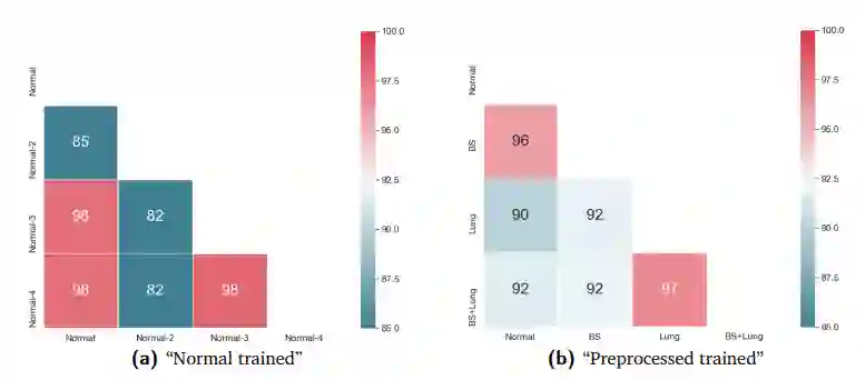 图 6.6:正常训练模型 (a) 和使用预处理图像训练的模型 (b) 的 Pearson 相关系数。正常模型之间的相关性已经很高,除了模型“Normal-2”,它似乎收敛到不同的最优值。使用预处理图像训练的模型具有较低的相关性(大约 92%)。这表明(b)中显示的模型的集合可以对分类性能产生更大的影响。