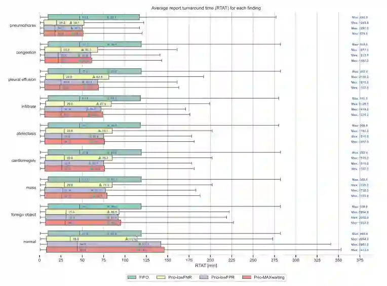 第 7 章介绍了将深度学习的疾病分类转化为特定的临床应用。在获得胸部 X 光片后,通常会将它们分类到工作清单中。根据每个放射科的工作流程,该工作清单按采集时间或手动优先级标签进行排序,并且在很大程度上,放射科医生按顺序处理他们的工作清单项目。因此,工作清单只按照先进先出的原则进行处理。一种最先进的胸部 X 光疾病分类算法可以自动分配优先级标签,这可以大大改善工作列表的排序。本章介绍了一种用于模拟临床工作日的新颖模拟框架,它突出了自动优先工作列表的效果。该框架使用来自汉堡-埃彭多夫大学医学中心的经验数据,可以模拟一个临床工作日,其中包括胸部 X 射线生成过程、胸部 X 射线的自动疾病分类以及放射科医师生成最终报告所需的时间 [ Baltruschat 等人,2020b]。值得注意的是,使用了第 5 章和第 6 章中提出的用于胸部 X 线疾病分类的改进方法。