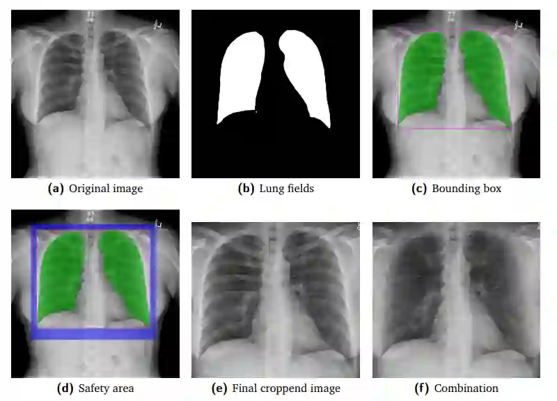图 6.2:肺田间种植方法概述。原始胸部 X 射线图像 (a) 由中心凹卷积神经网络处理以生成肺野分割 (b)。 (c) 以紫色显示计算的两个最大连接区域周围的边界框。在(d)中,由于分割掩码中的错误,蓝色区域强调了边界框的安全区域。 (e) 显示了最终的裁剪图像,(f) 显示了骨抑制和肺野裁剪的组合。