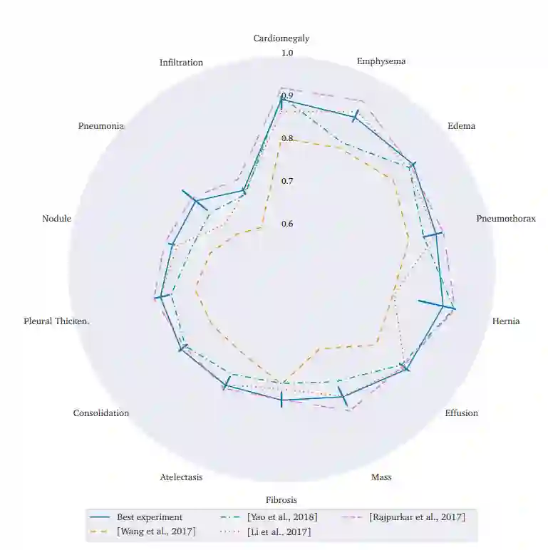 胸部 X 射线 (CXR) 成像是当今放射科最常见的检查类型。自动疾病分类可以帮助放射科医生减少工作量并提高患者护理质量。医学图像分析在过去十年中经历了范式转变,这主要归功于卷积神经网络 (CNN) 在许多图像分类、分割和量化任务中实现超人性能的巨大成功。 CNN 正在应用于 CXR 图像,但在临床环境中应用时,高空间分辨率、缺乏具有可靠基本事实的大型数据集以及种类繁多的疾病是重大的研究挑战。值得注意的是,这些挑战激发了本论文的新颖贡献。