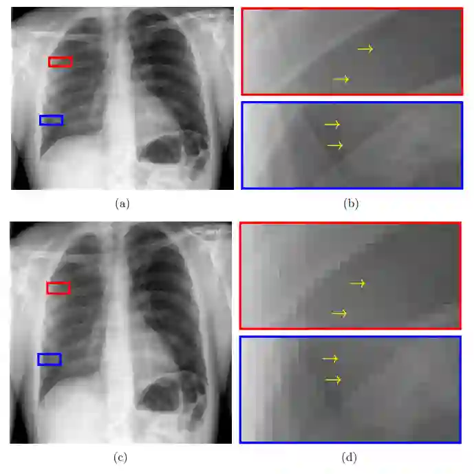 图 2.3:基于气胸的高分辨率和低分辨率胸部 X 光片的比较。 (a) 以 2828 × 2320 像素的全图像尺寸显示原始胸部 X 光片。在 (b) 中,显示了 (a) 的两个区域,放大了 10 倍。黄色箭头指向胸膜边缘,表示气胸。为了比较,(c) 显示 (a) 通过双线性插值缩小到 256 × 256 像素的图像大小。 (d) 显示与 (b) 相同的放大区域,胸膜边缘不再可见。示例图像取自 OpenI 数据集 [Demner-Fushman et al., 2016] (ID: 3378)。
