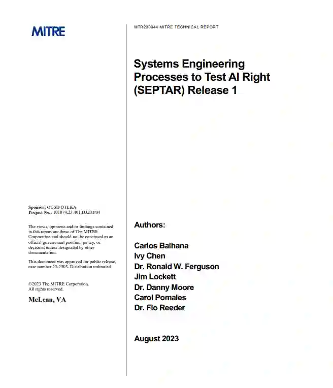 美国国防部(DoD)正在对人工智能(AI)研发(R&D)进行大量投资(147 亿美元),并通过各种项目获取人工智能。确保正确的流程执行可使这些投资得以实现,尤其是确保对预期的人工智能系统(AIES)进行有效评估的流程。SEPTAR(正确测试人工智能的系统工程流程)介绍了主动规划人工智能系统测试与评估(T&E)活动的好处和最佳实践。通过遵循这些最佳实践,AIES 更有可能按时交付,达到预算目标,并有效执行任务,满足任务预期。