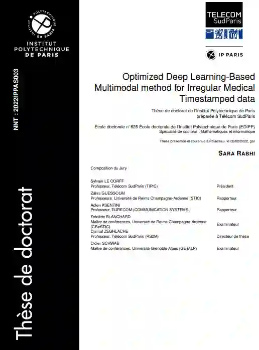 本论文分为三个部分。第一部分提供了促使我们做出贡献的相关工作,并分两章组织。在第一章中,我们建立了一个关于代表不规则临床时间序列的时间感知深度学习模型的调查。第二章详细介绍了用于命名实体识别的基于神经的架构和主动学习策略。另一方面,第二部分揭露了我们的三个主要贡献。第一章描述了已实现的时间框架,允许医学研究团队进行比较研究,并根据他们的数据集和预测任务选择最佳的DL模型来对IMTS进行分类。第二章定义了一种新的主动学习策略--动态混合加权不确定性采样(Dynamic-HWUS),旨在减少用于训练基于Transformer的命名实体识别模型的临床笔记的注释成本。第三章介绍了Multi-HiTT架构,该架构旨在结合不同层次的时间性和输入数据的类型,以建立一个准确的病人的代表。最后,第三部分包括三项验证我们提出的方法并使用真实世界的临床数据库的研究,讨论其结果,总结论文工作,并介绍对未来工作的建议。