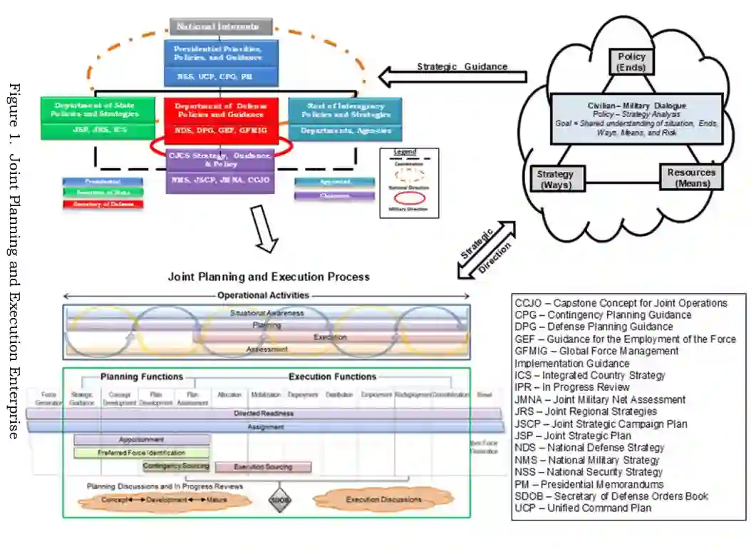 3. 联合规划与执行体系。 联合规划与执行体系是一个战争部的企业体系,由参谋长联席会议主席指令、流程、程序和报告结构组成,并由通信和信息技术支持,供联合规划与执行界(JPEC)用于监控、规划和执行与联合作战相关的动员、部署、运用、维持、重新部署和复员活动。图1是该体系的概念视图。这包括影响指导军事计划制定与执行的战略指导的军政对话。规划与执行为军政对话提供信息。随着方案被选定和计划被完善,规划提供详细行动方案(COAs),指挥官可据此做出明智决策。由此产生的、基于资源的计划,在可接受的风险下,以理解的假设为前提,平衡战略与作战目的、方式与手段,以追求政策目标。