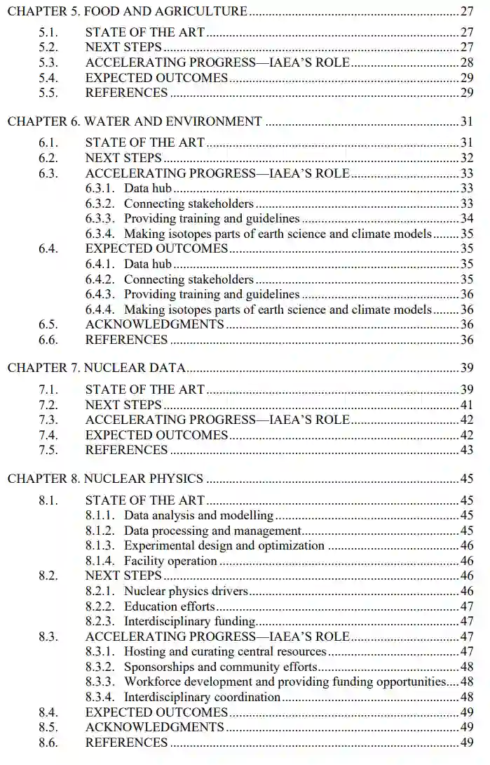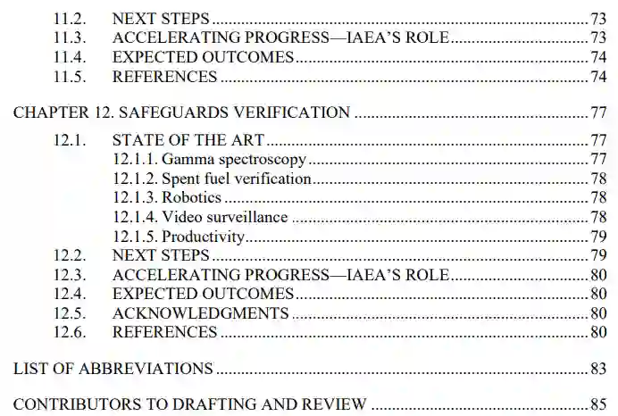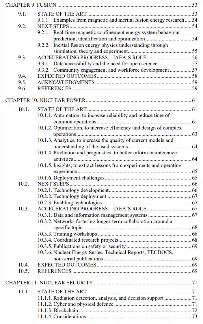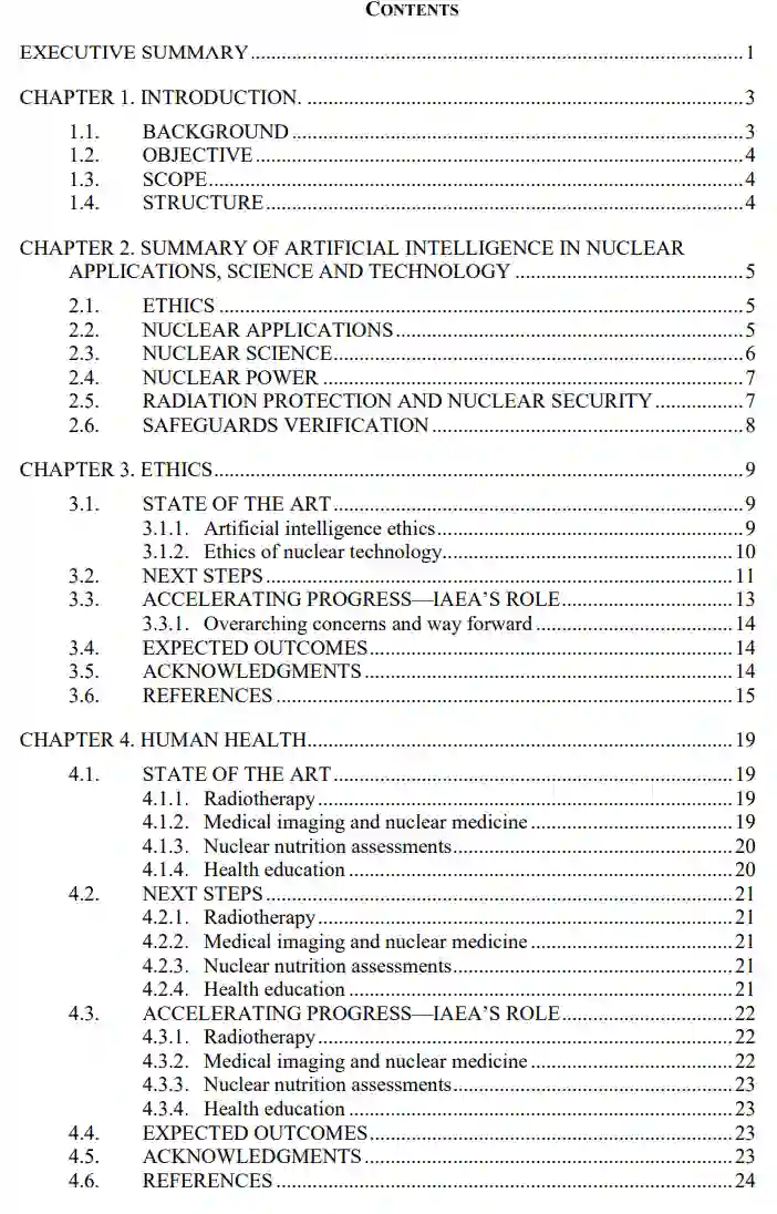 以下各章介绍了技术现状、核领域未来人工智能活动的优先事项以及IAEA在支持其实施方面的作用。第3章讨论了人工智能与核技术融合的伦理影响。第4-12章重点介绍人工智能在与IAEA工作领域相对应的核领域的应用,包括人类健康、食品和农业、水和环境、核数据、核物理、核聚变、核电、核安全和保障监督核查。
