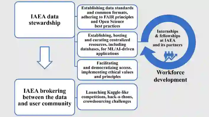 近年来,人工智能(AI)和机器学习(ML)方法已经在科学和技术领域产生了重大影响。这些从数据集或基于逻辑的算法中生成模型的方法,可以类似地加快核应用、科学和技术领域的发展,实现原子能机构促进和平、健康和繁荣的目标。如图1所示,为了在这些领域实现人工智能,特别是ML的进步,IAEA可以通过建立、托管和策划集中的资源,包括数据库,遵守FAIR(可查找、可访问、可互操作和可重用)原则和开放科学的最佳实践,提供数据共享的管理,支持培训工作和相关劳动力的发展,以及促成科学、技术、数学、人工智能和伦理学界之间的联系,发挥重要作用。