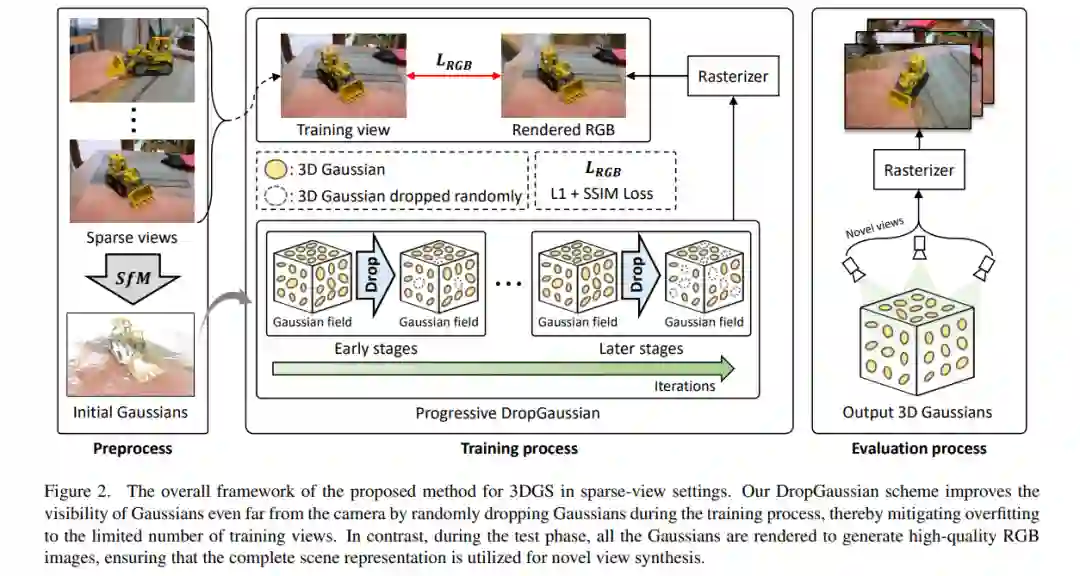 最近,3D 高斯溅射(3DGS)因其快速的性能和优秀的图像质量在新视角合成领域引起了广泛关注。然而,在稀视角设置下(例如,三视角输入),3DGS 经常面临过拟合训练视角的问题,这显著降低了新视角图像的视觉质量。许多现有方法通过使用强先验来解决这一问题,如 2D 生成的上下文信息和外部深度信号。与此不同,本文提出了一种无先验的方法——DropGaussian,通过对 3D 高斯溅射进行简单的改动。具体而言,我们在训练过程中以类似于 dropout 的方式随机删除部分高斯分布,这使得未被删除的高斯分布能够拥有更大的梯度,同时提高它们的可见性。这使得剩余的高斯分布在稀输入视角的渲染优化过程中能做出更多贡献。如此简单的操作有效地缓解了过拟合问题,并提升了新视角合成的质量。通过将 DropGaussian 简单应用于原始的 3DGS 框架,我们能够在基准数据集的稀视角设置下,获得与现有基于先验的 3DGS 方法相媲美的性能,而无需额外的复杂性。代码和模型可通过以下链接公开获取:https://github.com/DCVL-3D/DropGaussian release。