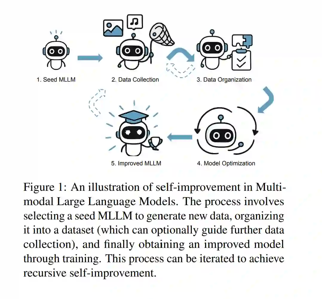 **自我改进(Self-improvement)旨在使模型具备自主收集与组织训练所需数据的能力,从而生成性能更优的下一代模型。这一范式为克服静态训练模式中成本高昂的扩展瓶颈与潜在性能上限提供了新的路径。 在多模态大语言模型(Multimodal Large Language Models, MLLMs)**中,自我改进的目标是让模型利用自身能力获取新的训练数据,并据此优化自身性能,从而实现持续改进。近期研究(Favero et al., 2024; Deng et al., 2024b; Amirloo et al., 2024)表明,这种方法能够在较低成本下显著减少幻觉现象(hallucination),并提升模型在通用任务上的表现。
