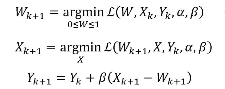 Y是拉格朗日乘数,β > 0是惩罚参数。α和β设置均为10。然后使用ADMM交替更新Wk+1、Xk+1和Yk+1: