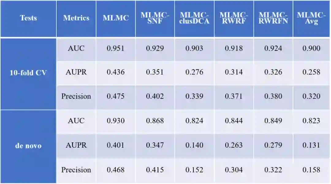 与其他最新的数据融合方法SNF、clusDCA、RWRF和RWRFN进行比较,将五个药物相似矩阵和两个疾病相似矩阵计算综合相似矩阵的过程替换为其他数据融合比较方法,实验结果如表2所示。MLMC在10倍交叉验证和de novo测试中表现最好,显示了多视图融合学习的优势。表2 MLMC与其他数据融合方法的AUC、AUPR和精度值******[1]**********