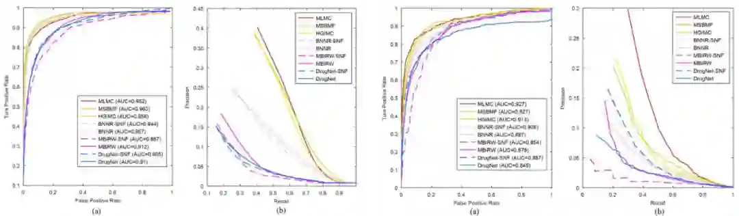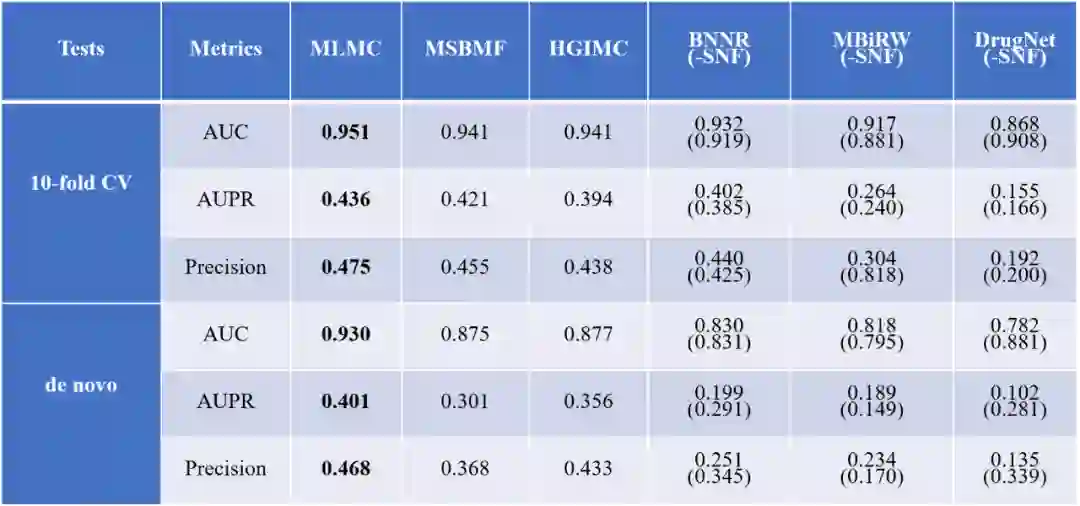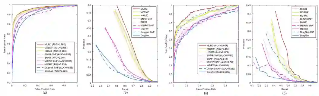 MLMC与MSBMF、HGIMC、BNNR、MBiRW和DrugNet这5种最先进的方法进行比较。表1表明,MLMC在经典数据集上的10倍交叉验证和de novo测试中均优于其他比较方法。 表1 MLMC与其他药物重新定位方法的 AUC、AUPR和精度值******[1]**********