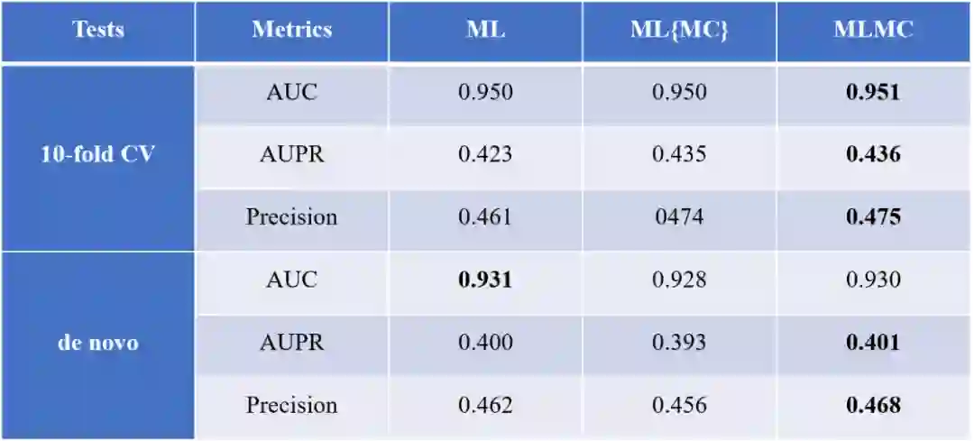 ML和ML{MC}作为MLMC模型的组件,分别评估其性能。表3显示了所有模型在10倍交叉验证和de novo测试的评估的结果。10倍交叉验证的结果表明MLMC效果最好,说明ML和ML{MC}的集成提升了预测性能。进一步发现ML{MC}的性能接近MLMC,并且两者都明显优于ML,这证明了MC在ML中的有效性。 表 3 ML、ML{MC}和MLMC的AUC、AUPR和精度值******[1]**********