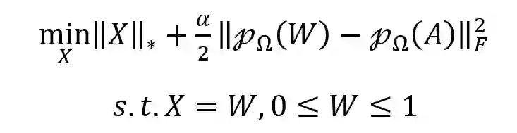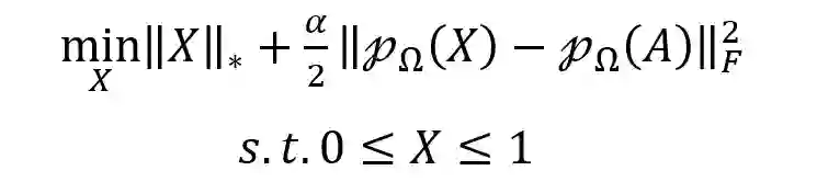 通过临床试验验证的药物-疾病关联只有少数,而未知或潜在关联的数量要多得多,从而导致关联矩阵稀疏且不完整。因此引入有界矩阵补全(BMC)作为多视图学习方法的预处理步骤。填充药物-疾病关联矩阵中缺失的条目使多视图学习的信息更加丰富,有助于提高预测性能。公式如下: