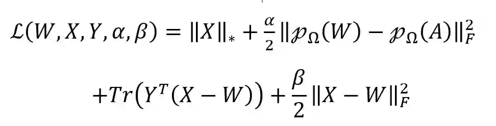‖X‖*表示X的核范数,定义为X的所有奇异值和。α是平衡核范数和误差项的参数。A是原始药物-疾病关联矩阵。Ω是包含A中所有已知条目的集合,pΩ 是到Ω上的投影算子。 上述模型可以通过交替方向乘子算法(ADMM)求解,设W是一个新的辅助矩阵: