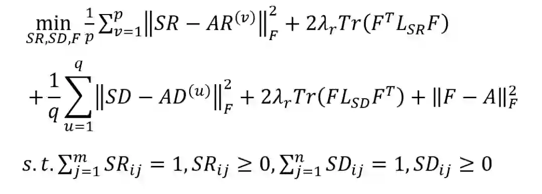 AR(ν)表示每个视图对应的药物相似度矩阵,AD(ν)表示疾病相似度矩阵,Tr(·)和‖·‖F分别表示矩阵的迹和Frobenius范数。LSR是SR的拉普拉斯矩阵,定义为LSR = DSR - (SRT + SR)/2。DSR是对角矩阵,其第i个对角项为∑j (SRij + SRji) / 2。LSD表示为 SD的拉普拉斯矩阵。A代表原始药物疾病关联矩阵,F是预测的关联矩阵。并且引入了两个参数λr和λd来平衡学习相似矩阵和预测关联矩阵。 固定SD和SR,上述目标函数转化为如下子问题: