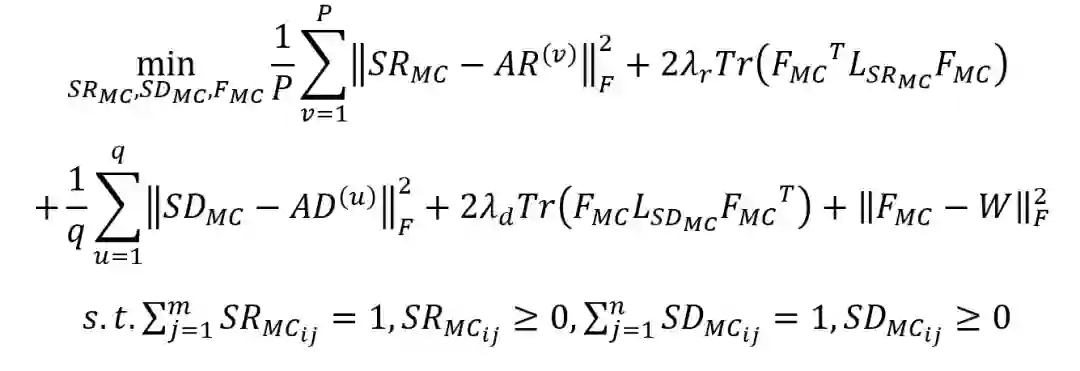 现有数据集多含有固有噪声,单个相似度矩阵则多不完整且稀疏,以上因素都会影响预测方法的准确性。利用多视图学习不仅能基于不同角度充分反映实体特征多种相似性信息以进行关联预测,还可以有效地整合来自多个生物数据源的相似性信息。 多视图方法将药物和疾病的多种信息视为不同的视图,通过整合这些多数据源来提高预测性能。假设在药物空间中有 p=5个视图,对应于相似矩阵AR(1)、AR(2)、AR(3)、AR(4)、AR(5),并且疾病空间中有q=2个视图,表示为AD(1)、AD(2)。研究人员提出一个多视图学习的目标函数,它通过最小化AR中不同相似视图的不一致性来学习一个综合药物相似矩阵SR,根据多视图相似AD以同样的方式得到一个综合疾病相似矩阵SD 。此外,在目标函数中引入拉普拉斯图正则化项,防止学习到的综合相似度矩阵过拟合,最终用于预测药物-疾病关联矩阵F。下面的目标函数展示了多视图学习的全过程: