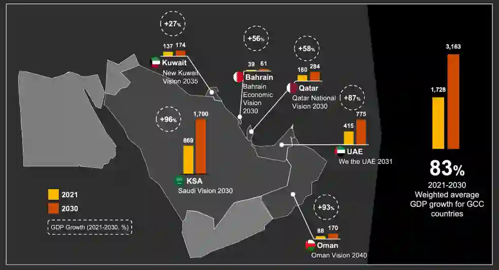 海合会各国提出的国家愿景认识到,数字技术和新兴技术在实现经济持续增长方面发挥着至关重要的作用,它们与其他推动因素一起,将该地区的国内生产总值从 2021 年的 170 亿美元提升到 2030 年 320 亿美元的目标--增长率高达 83%。
