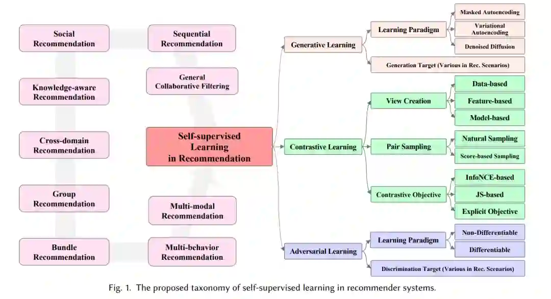 全面的论文集合。我们对超过160篇探索推荐领域中自监督学习应用的论文进行了彻底的回顾,使用包括“自监督”、“对比”、“生成”、“对抗”、“变分”、“扩散”和“遮蔽自编码器”等特定关键词进行搜索,并结合“推荐”和“推荐系统”进行搜索,这些论文主要来源于KDD、SIGIR、WWW、ICLR、WSDM、CIKM、ICDE、AAAI、IJCAI、RecSys、TOIS、TKDE等知名会议和期刊。