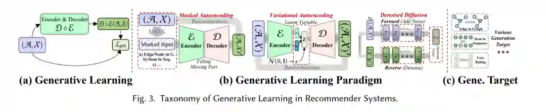 在生成自监督学习(GL)中,主要目标是最大化真实数据分布的似然估计。这使得学习到的有意义的表示能够捕捉数据中的基本结构和模式,随后可以用于下游任务。在我们的分类中,我们考虑两个方面来区分具有GL的各种推荐方法:生成学习范式和生成目标。