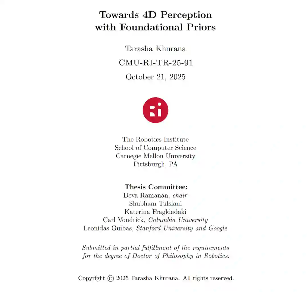 作为人类,我们始终在与一个三维动态世界进行交互与观察。要在视觉算法中构建这种时空(spatiotemporal)或四维(4D)理解并非易事,因为与二维图像和视频相比,四维数据的规模要少上几个数量级。这凸显了一个关键需求——如何以有意义的方式利用二维数据来实现四维任务。 近期在“基础模型(foundation models)”构建方面的进展,使我们能够从互联网规模的数据中以数据驱动的方式学习到生成性/结构性先验(generative/structural priors),从而免费获取这些丰富的现实世界先验。在本论文中,我们探讨了如何调整和利用这些先验,以应对诸如非显式(amodal)跟踪与补全、动态重建以及下一时刻预测等四维感知任务。