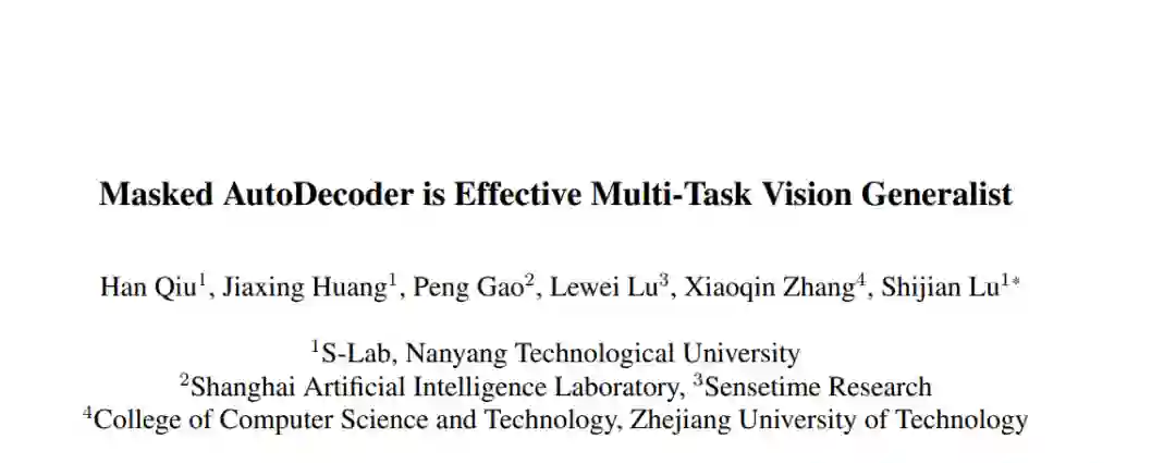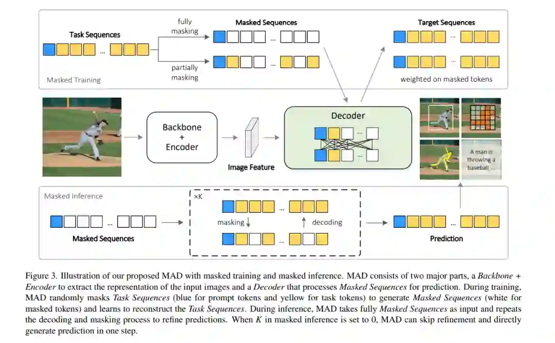 受到自然语言处理(NLP)中通用模型成功的启发,近期研究尝试将不同的视觉任务统一到相同的序列格式中,并使用自回归的Transformers进行序列预测。它们应用单向注意力来捕捉序列依赖性,并递归生成任务序列。然而,这样的自回归Transformers可能不适合视觉任务,因为视觉任务序列通常缺乏在自然语言中通常观察到的序列依赖性。在这项工作中,我们设计了Masked AutoDecoder (MAD),一个有效的多任务视觉通用模型。MAD包含两个核心设计。首先,我们开发了一个并行解码框架,引入双向注意力以全面捕捉上下文依赖性,并并行解码视觉任务序列。其次,我们设计了一种遮蔽序列建模方法,通过遮蔽和重构任务序列来学习丰富的任务上下文。通过这种方式,MAD通过单一网络分支和简单的交叉熵损失处理所有任务,最小化任务特定设计。广泛的实验展示了MAD作为统一各种视觉任务新范式的巨大潜力。与自回归对手相比,MAD实现了更优的性能和推理效率,同时与任务特定模型保持竞争力的准确率。代码将在https://github.com/hanqiu-hq/MAD 发布。