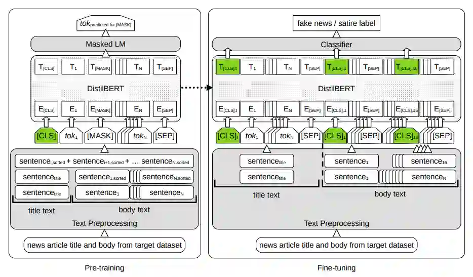 图 3.1: 假新闻和讽刺作品分类框架。图中展示的特定配置(MultiCLS-SimSents-Title+Body)是使用与目标/下游假新闻和讽刺分类任务所用数据集相同的掩码语言建模任务进行预训练的。在预训练过程中,文章正文中的句子首先按照与标题(SimSents)的相似度重新排序。然后,随机选取一个句子 i 作为起点,将其与后面的句子连接起来,并进行标记化处理。在微调过程中,DistilBERT 参数使用预训练结束时获得的值进行初始化。在微调(MultiCLS)过程中使用了 17 个特殊的聚合标记[CLS],其中 1 个用于文章标题,其余 16 个用于文章正文的前 16 个句子,并保留其原始顺序(标题+正文)。