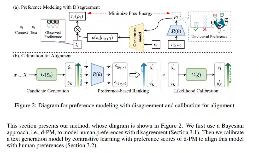 在推进以人为中心的自然语言生成(NLG)系统的征程中,确保NLG模型与人类偏好之间的对齐至关重要。为了达到这种对齐,当前流行的方法利用了一个基于人类反馈训练的奖励模型的强化学习(RL)方法。然而,由于人类偏好的主观性质导致的固有不同意见为训练奖励模型带来了巨大的挑战,导致NLG性能的下降。为了应对这个问题,之前的方法通常依赖于多数投票或平均来整合多个不一致的偏好。尽管这样的方法易于理解和执行,但它们无法捕捉到人们之间的微妙不同意见程度,可能只代表一小部分人,从而缺乏定量揭示人类偏好普遍性的能力。为了应对这一挑战,本文提出了一种新颖的方法,该方法采用贝叶斯框架来考虑人类偏好中不同意见的分布,并将其命名为d-PM。此外,考虑到RL策略在训练效率上的低效和复杂,我们进一步提议使用对比学习策略来训练NLG模型,该模型使用从d-PM模型得到的偏好分数。在两个以人为中心的NLG任务,即情感支持对话和完整性“经验法则”生成上的广泛实验表明,我们的方法在自动和人工评估中都一致超越了先前的SOTA模型。