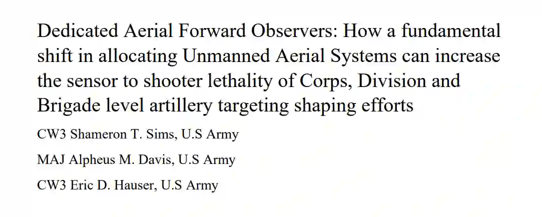 本文将讨论一种理论,即兵团的 FAB、DIVARTY 和 BCT DS 野战炮兵 (FA) BN 获得由师/兵团各自下属的战斗航空旅 (CAB) 的一个灰鹰 (GE) 排(DS FA BN 的影子无人机系统/未来战术无人机系统 (FTUAS) 排)组成的目标定位分队的作战控制 (OPCON)、 以及进行开发所需的人员,使炮兵部队指挥官能够为这些师和军团指挥官主导瞄准过程。这一解决方案可确保野战炮兵部队能够打击目标、削弱敌方远程火炮、瓦解综合防空能力,并提高杀伤链的有效性,以满足其指挥官的作战优先级。本文还将从条令、组织、训练、物资、领导与教育、人员、设施和政策(DOTMLPF-P)模型的角度来审视问题,为从可能的训练概念到全军实施的建议提供一个整体视角。