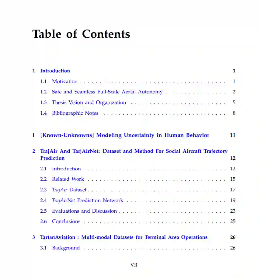 针对分布外风险(out-of-distribution risk),我们设计了一个融合框架,将**神经模仿学习(neural imitation learning)与符号规则系统(symbolic rule-based systems)结合,提升泛化与安全性。此外,为缓解模型偏差带来的风险,我们探讨了结合检索增强生成(Retrieval-Augmented Generation, RAG)**与事故报告的方式,以实现复杂环境下基于真实数据的行动裁决(action arbitration)。 在航空领域的真实行为学习方面,我们构建并发布了三个关键数据集: * TrajAir:一个面向社交空中导航的轨迹数据集; * TartanAviation:一个用于意图推理的时间同步多模态数据集; * Amelia-48:覆盖美国多个机场的大规模地面滑行数据集,用于空中交通管理中的预测分析任务。