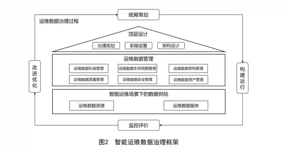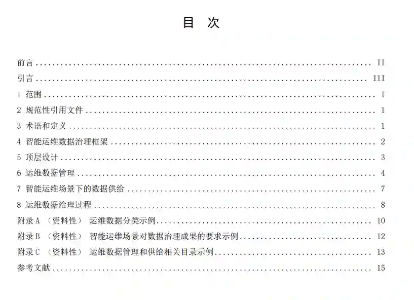 本标准确立了支撑智能运维场景的数据治理框架,规定了在智能运维场景 下,运维数据治理顶层设计、运维数据管理、数据供给和运维数据治理过程的 要求。主要技术内容包括四个部分:顶层设计、运维数据管理、智能运维场景 下的数据供给和数据治理过程。顶层设计部分承接组织上层战略规划并对接场 景需求;运维数据管理域部分明确运维数据管理的过程和方法要求;智能运维 场景下的数据供给部分对开展运维数据治理后至少应获得的成果进行了定义和 要求,包括运维数据资源和运维数据服务;数据治理过程部分从统筹策划、构 建运行、监控评价、改进优化四个维度对运维数据治理进行评价和改进,以提 升运维数据管理水平,更好地支撑智能运维中的数据应用场景。