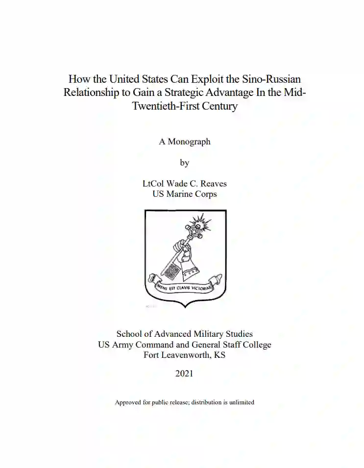 学术界和军方的许多人将现有的中俄伙伴关系视为对美国全球霸权的威胁,但却没有提供美国可以采取的行动方案来削弱中俄关系。在了解了20世纪和21世纪的政治和军事事件后,美国可以利用中俄之间的政策差异,这可能使美国在21世纪中期获得战略优势。鼓励印度和俄罗斯之间的合作,除了强调中国和俄罗斯之间的长期边界争端之外,再加上美国在亚热带地区对中国的有利政策,可以进一步分化中俄两国的关系。利用国际组织、亚洲的盟友和信息行动,美国可以在中国和俄罗斯之间制造距离,同时为美国提供机会,与中国和俄罗斯独立竞争,而不是作为共同交战国。