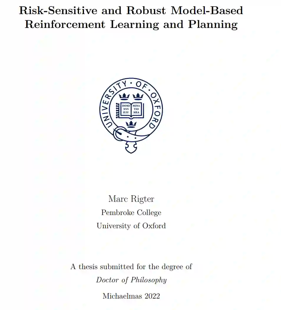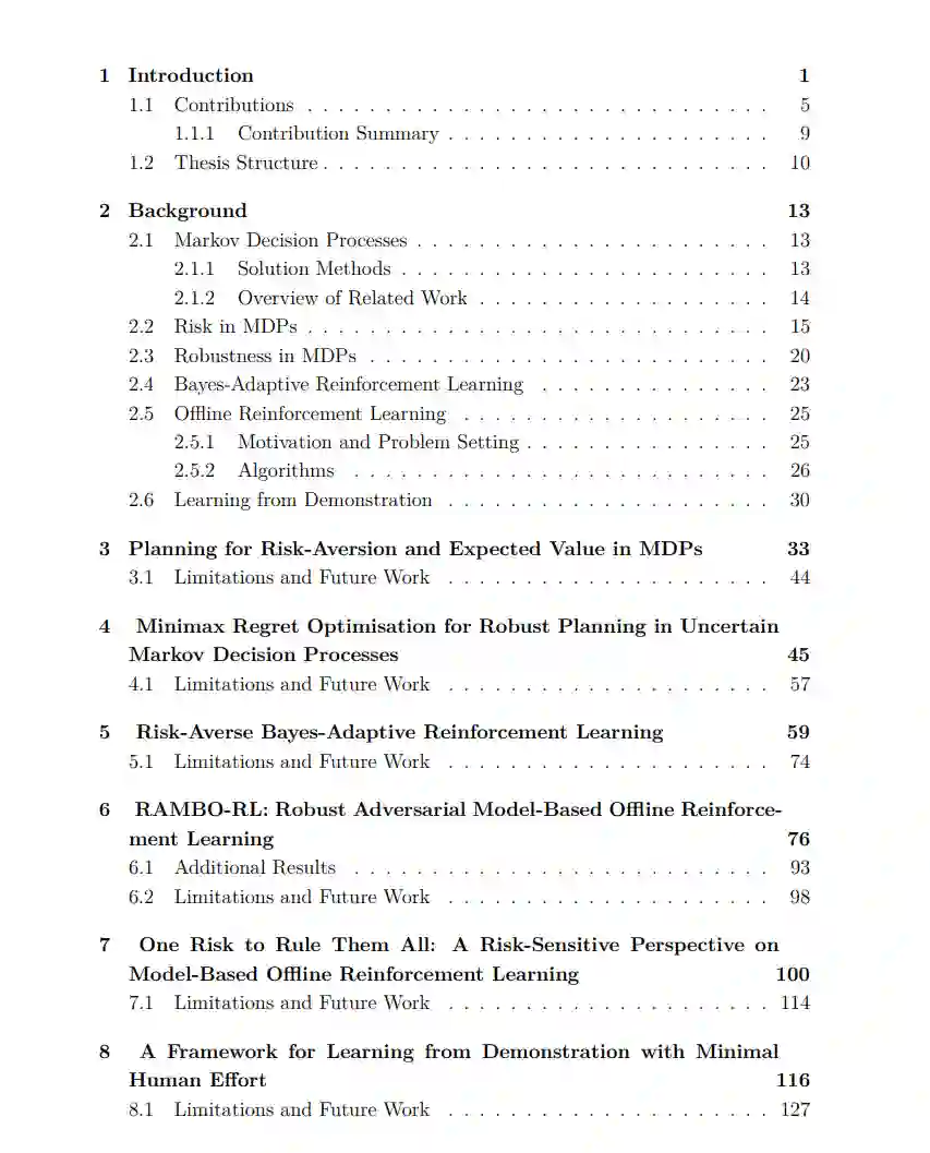 本文为这一目标做出了一些贡献,重点是基于模型的算法。本文从考虑马尔可夫决策过程(MDP)完全已知的最简单情况开始,提出了一种优化风险规避目标的方法,同时将优化期望值作为次要目标。对于本文的其余部分,我们不再假设MDP是完全指定的。考虑MDP上不确定性的几种不同表示,包括a)候选MDP的不确定性集合,b) MDP的先验分布,以及c)与MDP交互的固定数据集。在设置a)中,提出了一种新的方法来近似最小化最大遗憾目标,并在所有候选MDP中找到一个低次优的单一策略。在b)中,我们建议在贝叶斯自适应MDP中优化风险规避,以在单一框架下避免认知和偶然不确定性带来的风险。在c)中,离线强化学习设置,本文提出两种算法来克服由于只能访问固定数据集而产生的不确定性。第一种方法提出了一种可扩展的算法来解决离线强化学习的鲁棒MDP公式,第二种方法基于风险敏感优化。在最后一章中,我们考虑一种从演示中学习的交互式表述。在这个问题上,有必要对当前政策执行的不确定性进行推理,有选择地选择何时要求进行示威。实验证明,所提出的算法可以在许多不同的领域中产生风险敏感或鲁棒的行为。