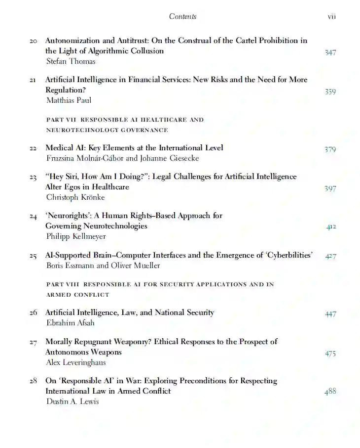 这本手册由八部分组成,首先从负责任AI的基础开始(第一部分),然后是当前和未来的AI治理方法(第二部分),这些方法不仅限于欧洲和美国的方法。作者们进一步分析了责任制度(第三部分),并在负责任的数据治理方法被更详细地审查之前(第五部分),阐明了AI系统中的公平性和非歧视的核心问题(第四部分)。第六部分和第七部分的作者们讨论了AI系统特定领域的合理治理方法:这些系统可以是包括金融服务在内的公司治理以及包括神经技术在内的医疗保健领域的重要部分。第八部分的作者们特别处理了一些特别棘手和具有挑战性的问题,如AI在安全应用和武装冲突中的使用。