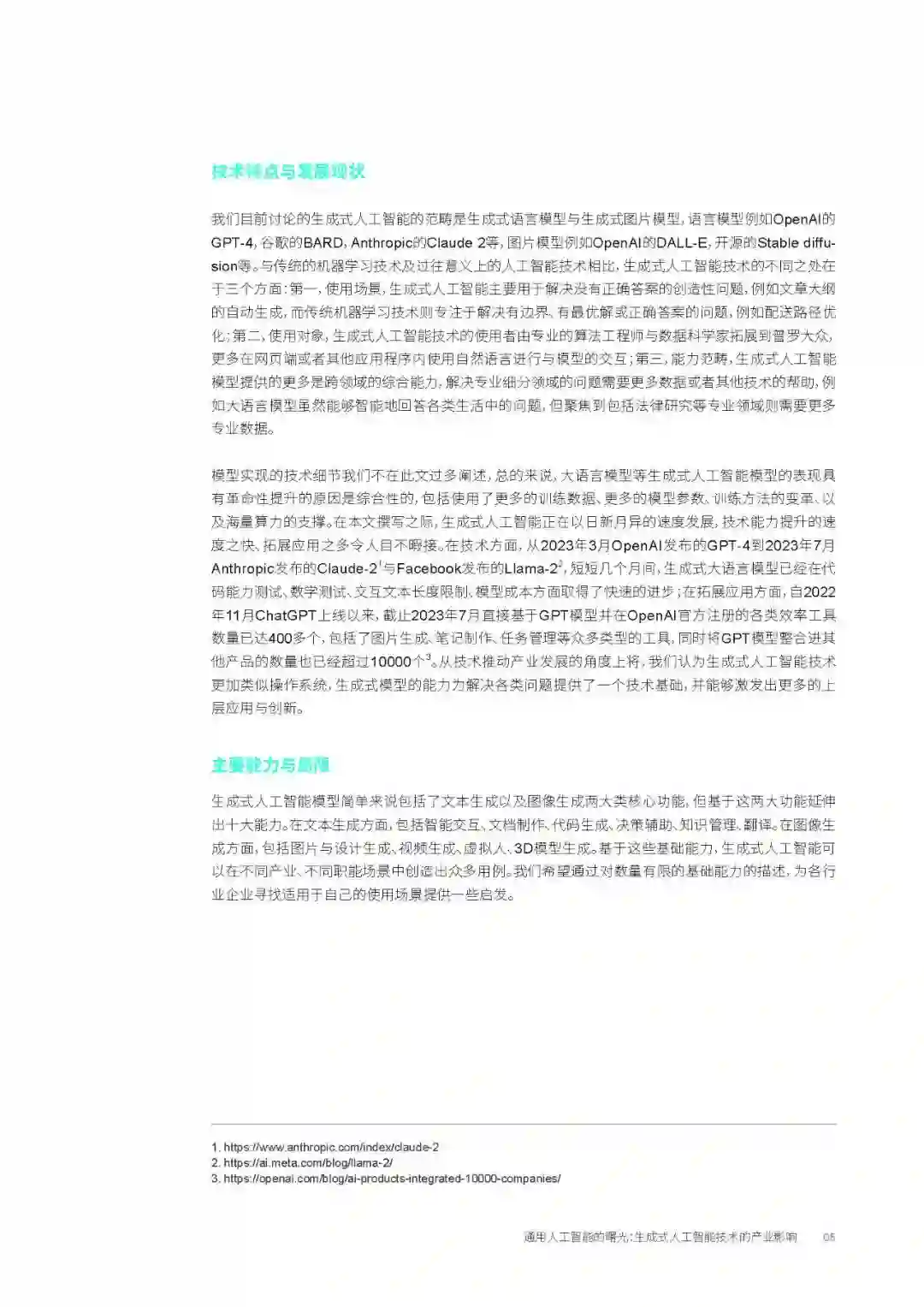 从技术推动产业发展的角度,我们认为生成式人工智能技术是一项具有通用型技术潜力的软件技术。 产业应用方需要清晰的认识到其作为一项软件技术的定位与局限性,但同时认识到它是一项具有操作 系统级别平台效应的软件技术,在商业世界中能够带来的价值会随着应用场景的不断拓展而增加,并 有可能构建出新的应用生态、创造新的用户接口、并带来潜在商业模式的变革。