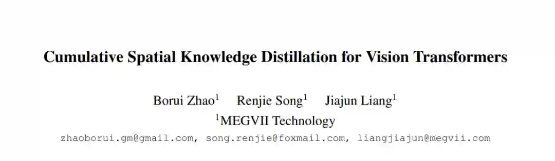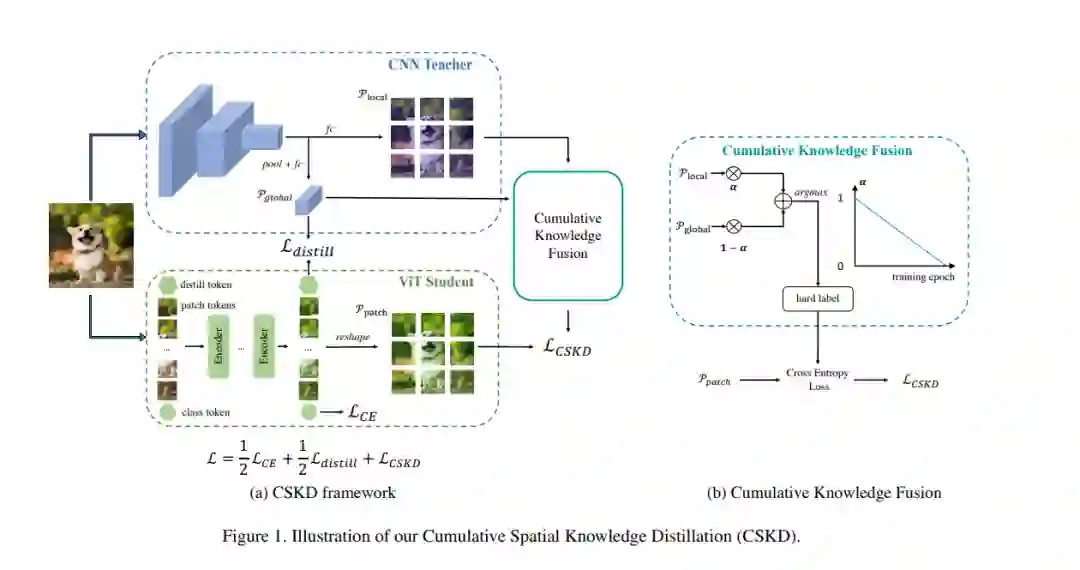“累积空间知识蒸馏”(Cumulative Spatial Knowledge Distillation,CSKD)是一个深度学习中针对视觉变换器(ViTs)进行知识蒸馏的方法。CSKD的设计目标是解决从卷积神经网络(CNNs)中提取知识时所遇到的两大问题:(1) CNN和ViT网络设计完全不同,导致中间特征的语义级别不同,使得基于空间的知识传递方法(例如,特征模拟)效率低下;(2) 从CNN中提取知识会限制ViT在后期训练中的网络收敛,因为CNN的局部归纳偏见监督抑制了ViT整合全局信息的能力。 CSKD方法从CNN对应的空间响应中提取基于空间的知识,然后将其蒸馏到ViT的所有补丁令牌,而无需引入中间特征。此外,CSKD利用了累积知识融合(CKF)模块,该模块引入了CNN的全局响应,并在训练过程中逐渐强调其重要性。应用CKF在早期训练期间利用了CNN的局部归纳偏见,而在后期充分发挥了ViT的全局能力。在ImageNet-1k和下游数据集上的大量实验和分析证明了我们的CSKD方法的优越性。代码将公开发布。