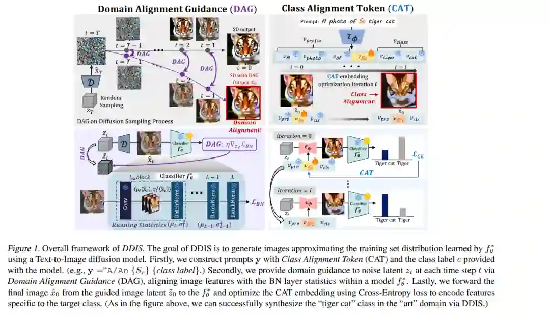 开源的预训练模型具有广泛的应用潜力,但当其训练数据不可获取时,模型效用会显著下降。无数据图像合成(Data-Free Image Synthesis,DFIS)旨在在不访问原始数据的前提下,生成逼近预训练模型所学习数据分布的图像。然而,现有 DFIS 方法因缺乏关于自然图像的先验,往往生成与真实训练数据分布偏离的样本。 为克服这一限制,我们提出 DDIS——首个扩散辅助的无数据图像合成方法。DDIS 利用文本-到-图像扩散模型作为强大的图像先验,显著提升合成图像质量。具体而言,DDIS 从给定模型中提取其学习到的数据分布知识,并用这些知识引导扩散模型,进而生成与训练数据分布高度对齐的图像。 为实现这一目标,我们提出: 1. 域对齐引导(Domain Alignment Guidance,DAG):在扩散采样过程中,使合成数据域与训练数据域保持一致。 1. 类别对齐标记(Class Alignment Token,CAT):通过优化单个 CAT 嵌入,有效捕捉训练数据集中各类别的特定属性。