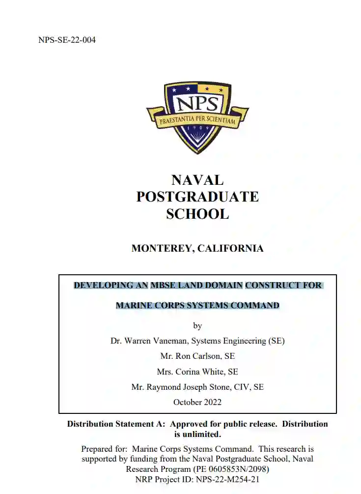 这项研究的目的是开发和评估一个通用本体和概念数据模型(CDM),该模型是为支持海军领域而创建的,适用于海军陆战队系统司令部(MCSC)和使用《2030年部队设计》(Congressional Research Service Insight, 2022)作为总体指导的陆地领域。通用本体和CDM的开发是探索性研究的一部分,它考虑了系统数据实体、属性和关系。这项研究工作确定了一个通用本体,并定义了一个CDM,从多个角度代表感兴趣的系统,并允许从整体上探索系统。这是实现基于模型的系统工程(MBSE)环境的基础。一个简明的本体允许系统实体被还原到其原子水平,然后通过建立CDM(即数据模式)允许定义系统的虚拟表示。本体和CDM确定了必须开发接口以交换数据的领域,并确定组织、建模语言、表现框架和工具之间的数据边界。研究方法考虑了设计一个通用本体的重要性,该本体全面地代表了整个生命周期的系统,分析了本体内定义的实体之间的关系,考虑了本体作为权威真理来源的基础,最后,设计了一个建模计划,描述了从基于文档的系统工程过渡到真正基于MBSE的土地领域的建议路径。总而言之,本体论和CDM的开发是为了定义整个系统在其生命周期中的实体和关系。这些产品利用代表美国海军陆战队陆域的《2030部队设计》的任务线进行了验证。利用这个本体和CDM以及衍生的建模计划,MCSC可以开始从基于文件的系统工程过渡到真正的基于MBSE的陆地领域。