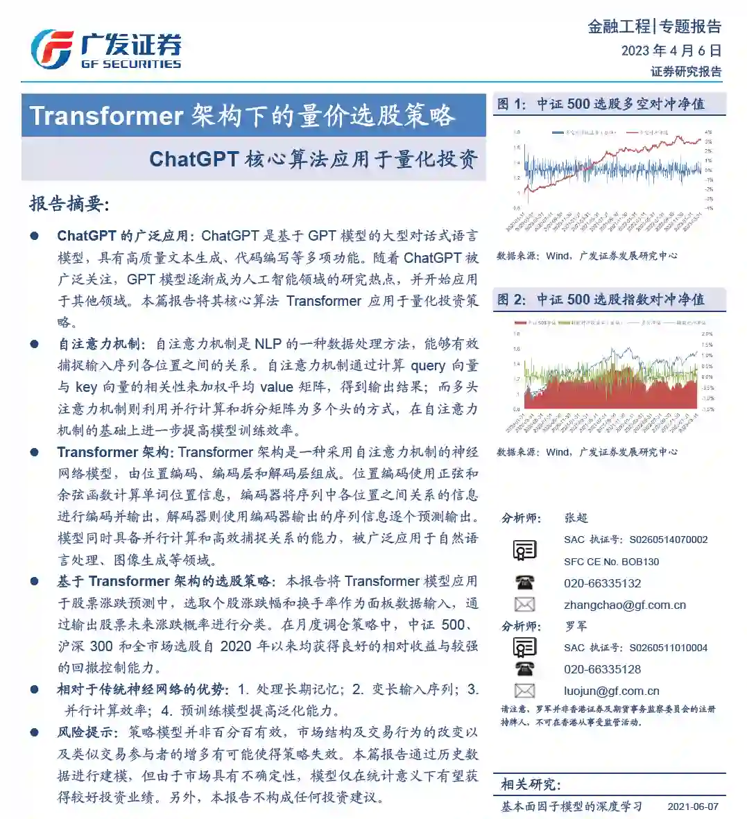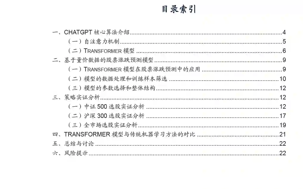 ChatGPT 的广泛应用:ChatGPT 是基于GPT 模型的大型对话式语言 模型,具有高质量文本生成、代码编写等多项功能。随着ChatGPT 被 广泛关注,GPT 模型逐渐成为人工智能领域的研究热点,并开始应用 于其他领域。本篇报告将其核心算法Transformer 应用于量化投资策 略。 自注意力机制:自注意力机制是NLP 的一种数据处理方法,能够有效 捕捉输入序列各位置之间的关系。自注意力机制通过计算query 向量 与key 向量的相关性来加权平均value 矩阵,得到输出结果;而多头 注意力机制则利用并行计算和拆分矩阵为多个头的方式,在自注意力 机制的基础上进一步提高模型训练效率。 Transformer 架构:Transformer 架构是一种采用自注意力机制的神经 网络模型,由位置编码、编码层和解码层组成。位置编码使用正弦和 余弦函数计算单词位置信息,编码器将序列中各位置之间关系的信息 进行编码并输出,解码器则使用编码器输出的序列信息逐个预测输出。模型同时具备并行计算和高效捕捉关系的能力,被广泛应用于自然语 言处理、图像生成等领域。 基于Transformer 架构的选股策略:本报告将Transformer 模型应用 于股票涨跌预测中,选取个股涨跌幅和换手率作为面板数据输入,通 过输出股票未来涨跌概率进行分类。在月度调仓策略中,中证500、 沪深300 和全市场选股自2020 年以来均获得良好的相对收益与较强 的回撤控制能力。 相对于传统神经网络的优势:1. 处理长期记忆;2. 变长输入序列;3. 并行计算效率;4. 预训练模型提高泛化能力。