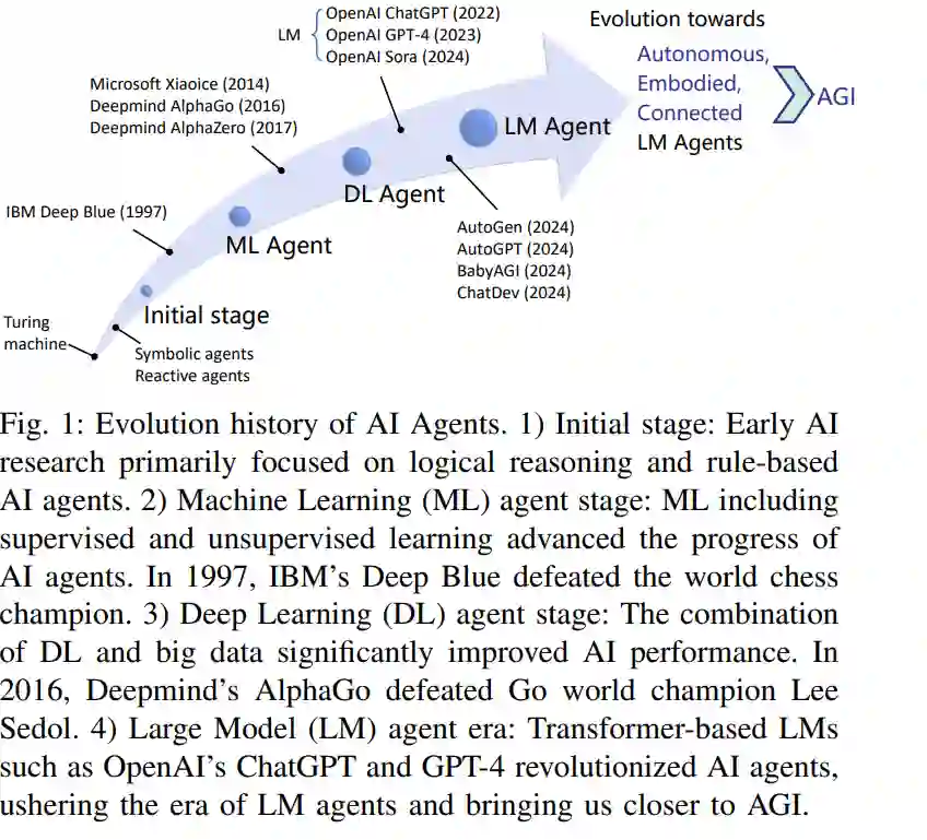 I. 引言 A. 大型模型智能体的背景 在1950年代,艾伦·图灵提出了著名的图灵测试,以评估机器是否能够表现出与人类相当的智能,为人工智能(AI)的发展奠定了基础。这些被称为“智能体”的人工实体,是AI系统的核心组件。一般来说,AI智能体是能够理解并响应人类输入、感知环境、做出决策并在物理、虚拟或混合现实环境中采取行动以实现其目标的自主实体[1]。AI智能体的范围从遵循预定义规则的简单机器人到通过经验学习和适应的复杂自主实体[2]。它们可以是基于软件的或物理实体,能够独立运行或与人类或其他智能体合作。 自20世纪中叶以来,AI智能体的发展取得了显著进展[3]–[5],如深蓝、AlphaGo和AlphaZero,如图1所示。尽管取得了这些进展,之前的研究主要集中在精细化专业能力上,如符号推理或在特定任务(如围棋或国际象棋)中表现优异,往往忽视了在AI模型中培养通用能力,如长期规划、多任务泛化和知识保留。创造能够灵活适应广泛任务和复杂环境的AI智能体的挑战仍然在很大程度上未得到探索。为了进一步推动AI智能体的边界,开发强大的基础模型以整合这些关键属性是至关重要的,为下一代AI智能体提供多功能的基础。 随着大型模型(LMs)的兴起,也称为大型基础模型,如OpenAI的GPT-4、Google的PaLM 2和Microsoft的Copilot,LMs为全面增强AI智能体的内在能力开辟了新可能性[6][7]。如图2所示,一个LM智能体,无论是软件形式还是具身形式,通常由四个关键组件组成:规划、行动、记忆和互动。这些智能体能够在物理、虚拟或混合现实环境中无缝操作[1][8]–[10]。特别是,LMs作为AI智能体的“大脑”,赋予它们在人机互动(HMI)、复杂模式识别、知识保留、推理、长期规划、泛化和适应性方面强大的能力[9]。此外,通过先进的推理和少量/零样本规划技术,如思维链(CoT)[11]、思维树(ToT)[12]和反思[13],LM智能体能够形成复杂的逻辑连接,有效解决复杂的多面任务。例如,AutoGPT[14],一个有前途的LLM智能体原型,可以将复杂任务分解为几个可管理的子任务,从而促进结构化和高效的问题解决。将LM与检索增强生成(RAG)技术[15]结合,进一步使智能体能够访问外部知识源,并基于检索的信息提高其响应的准确性。此外,LM智能体可以灵活集成多种LM,包括大型语言模型(LLM)和大型视觉模型(LVM),以实现多方面的能力。 LM智能体被视为实现人工通用智能(AGI)的一重要步骤,并广泛应用于网络搜索[16]、推荐系统[17]、虚拟助手[18][19]、元宇宙游戏[20]、机器人技术[21]、自动驾驶汽车[22]和电子设计自动化(EDA)[23]等领域。据MarketsandMarkets[24]报告,2023年全球自主AI和自主智能体市场的估值为480亿美元,预计到2028年将以43%的年均增长率增长,达到285亿美元。LM智能体引起了全球关注,包括Google、OpenAI、Microsoft、IBM、AWS、Oracle、NVIDIA和百度等领先科技巨头正在进入LM智能体行业。 ![]()