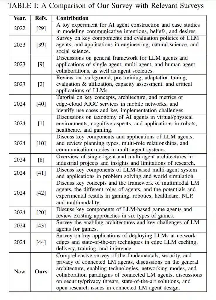 - 现有的LM智能体调查主要集中在单个LLM智能体和多智能体系统的一般框架设计及其在特定应用中的潜力上。本综述不同于上述现有调查,重点关注LM智能体的网络方面,包括一般架构、启用技术和合作范式,以构建在物理、虚拟或混合现实环境中联网的LM智能体系统。此外,随着LM智能体的进展,研究它们在未来AI智能体系统中的安全性和隐私性变得迫在眉睫。本研究全面回顾了LM智能体的安全和隐私问题,并讨论了现有和潜在的防御机制,这些内容在现有调查中常被忽视。表I比较了本调查与LM智能体领域先前相关调查的贡献。