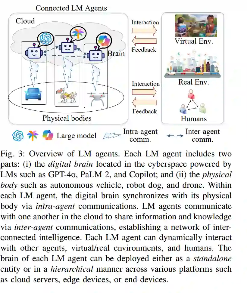 - 物理世界与LM智能体之间的信息流:得益于数字双胞胎技术,LM智能体能够在其物理身体和数字大脑之间同步数据和状态,形成无缝互动循环。LM智能体还可以监控并对环境的实时输入作出反应。这种双向同步使LM智能体能够以高精度和响应性感知和应对其周围环境,无论是虚拟还是现实,从而弥合数字与物理领域之间的差距。通过不断从环境反馈中学习,LM智能体能够积累知识并理解物理法则,从而解决复杂的现实世界问题。这一迭代学习过程确保LM智能体不仅对即时刺激作出反应,还能随着时间推移不断优化其具体行动,达到更复杂和有效的解决方案。