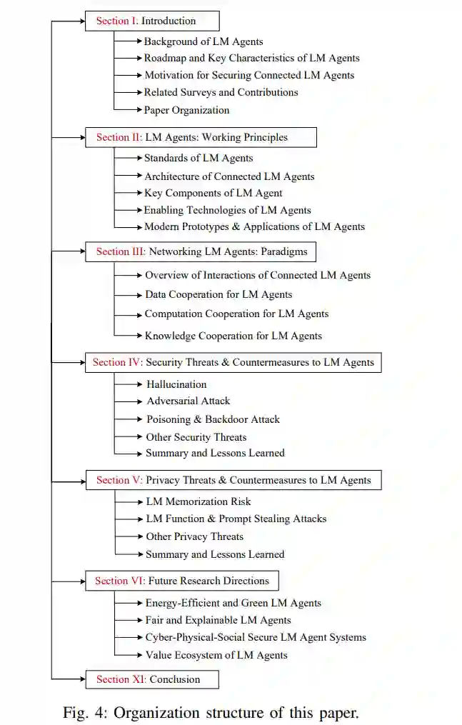 E. 论文组织 本文其余部分组织如下。第二节讨论单个LM智能体的工作原理,第三节介绍连接LM智能体的合作范式。第四节和第五节分别介绍LM智能体的安全和隐私威胁的分类,以及最新的对策。第六节概述LM智能体领域的开放研究问题和未来方向。最后,第七节给出结论。图4描绘了本综述的组织结构。 ![]()