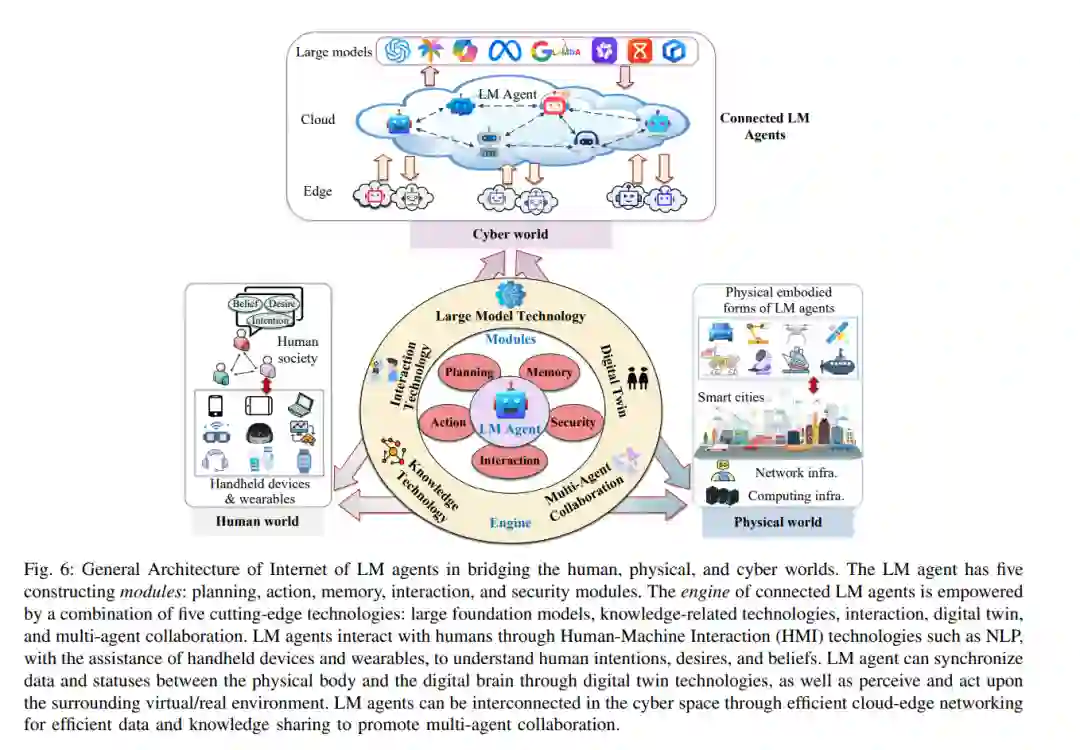 - 人类世界与LM智能体之间的信息流:人类通过自然语言、移动智能设备和可穿戴技术与LM智能体互动,使LM智能体能够理解人类指令并有效解决现实问题。LM智能体反过来从人类输入中获取新知识和数据,帮助其持续改进和学习。这一持续更新和优化模型的过程,使LM智能体能够提供越来越准确和有用的信息。在AR和VR环境中,LM智能体能够在虚拟场景中与人类用户协作,如建筑设计,提升整体效率和创造力[50]。
