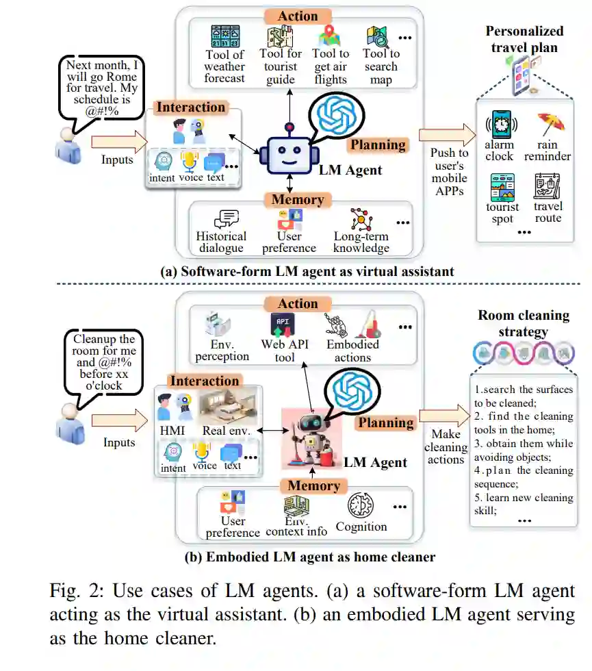 - 具身智能。尽管近年来取得了一些进展,LM通常被动地响应人类在文本、图像或多模态领域的命令,而不直接与物理世界互动[7]。而具身智能体可以主动感知和作用于其环境,无论是数字、机器人还是物理环境,使用传感器和执行器[21][25]。向LM赋能的智能体的转变涉及创建能够理解、学习和解决现实世界挑战的具身AI系统。如图2(b)所示,LM智能体主动与环境互动,并根据实时反馈调整行动。例如,一台负责清洁的家庭机器人LM智能体可以通过分析房间布局、表面类型和障碍物来生成量身定制的策略,而不仅仅是遵循通用指令。