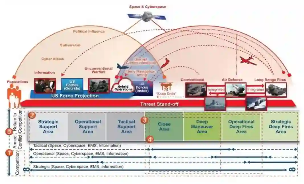 MDO似乎是专门为对抗同级别对手的高端常规冲突量身定做的,尤其是在欧洲和印太战区。由于MDO的核心是基于与“同级别竞争对手”的潜在对抗和挑战而塑造的,它要求美国发展一支能够渗透和瓦解分层反介入/区域拒止系统、在有争议的领域作战、并整合联合及盟友能力以在决定性节点达成融合效果的部队。在印太和欧洲作战战区,由防空、精确打击、电子战以及情报、监视和侦察(ISR)系统配置等集成且不同的要素所组成的此类网络占据主导。因此,MDO的基本组成部分——远程精确火力、纵深感知、联合域融合、网络-电子战一体化及分层决策——是针对与先进大国军队进行大规模、高节奏、高技术、高强度冲突而设计的。
