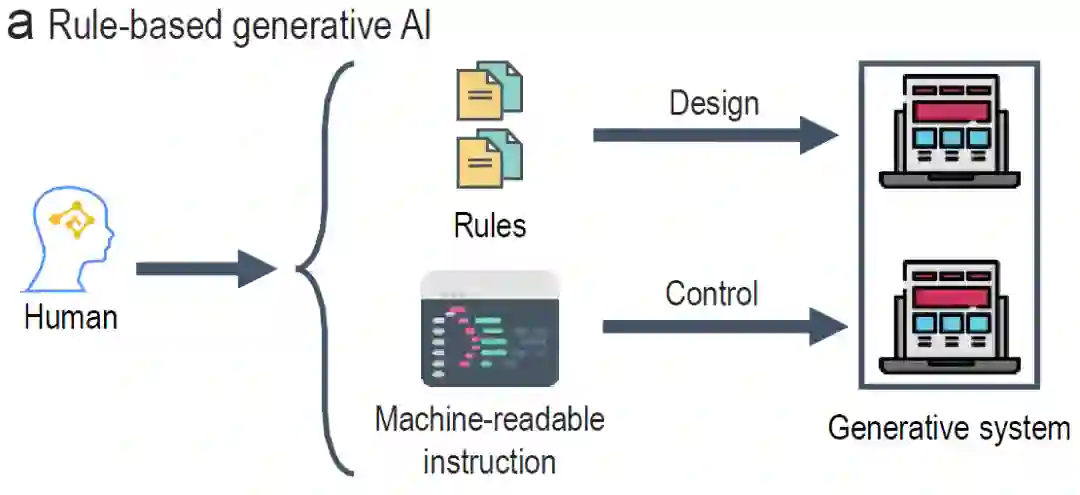 本文将生成式人工智能的发展过程归纳为四个阶段,并以当时代表性的技术命名:第一阶段是基于规则的生成式系统;第二阶段是基于模型的生成式算法;第三阶段是深度生成式算法;第四个阶段是预训练基础模型。文章分析了各阶段之间的关键联系与区别,探讨了生成式人工智能发展的机遇与挑战。基于规则的生成式系统兴起于 20 世纪 50 年代,在生成式人工智能技术发展的早期阶段扮演了至关重要的角色,在聊天机器人、机器翻译系统等应用场景中取得了一定成果。从技术本质而言,此类方法(见下图)可视为执行人工设计规则的计算机程序,具备两大特征:其一,高度依赖人类知识与经验;其二,生成过程具备透明性与可解释性。这类方法在灵活性与扩展性存在局限,主要适用于场景固定、模式单一的任务。